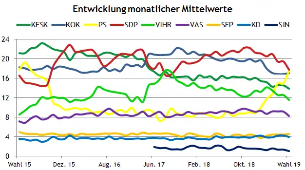 | 09.04.2019 | Taloustutkimus | 14,5 % | 15,9 % | 16,3 % | 19,0 % | 12,2 % | 8,7 % | 4,9 % | 4,3 % | 0,8 % | 3,4 % |