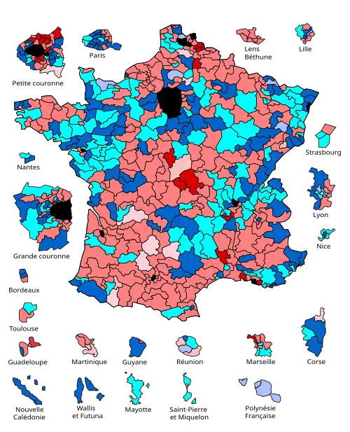 - Zwei Wahlkreise (Polynésie I und Polynésie II) sind ausgeschlossen.