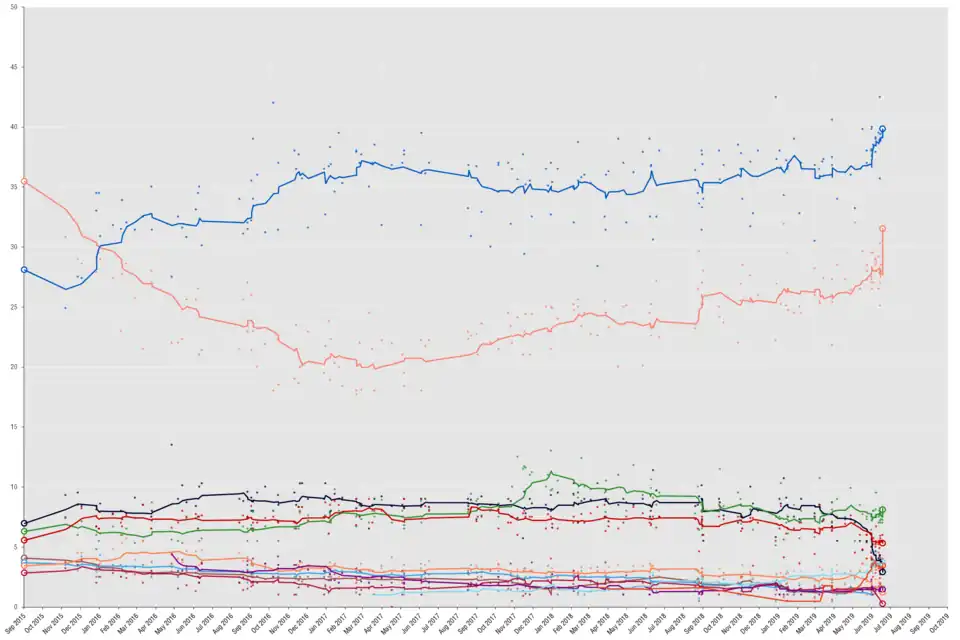 Umfragen seit 2016 ergaben, dass die regierende SYRIZA massiv an Zustimmung verlor. Stärkste Partei in den Umfragen war die konservative Nea Dimokratia.[9] Umfragen prognostizierten den Einzug von fünf Parteien in das griechische Parlament, der Einzug der rechten Elliniki Lysi und der liberalen Enosi Kendroon (EK) erschien unsicher.