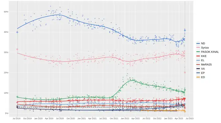 - ↑ Newsroom: Δημοσκόπηση ΣΚΑΪ: Με 6,5 μονάδες προηγείται η ΝΔ έναντι του ΣΥΡΙΖΑ | ΣΚΑΪ. 25. April 2023, abgerufen am 2. Mai 2023 (griechisch).