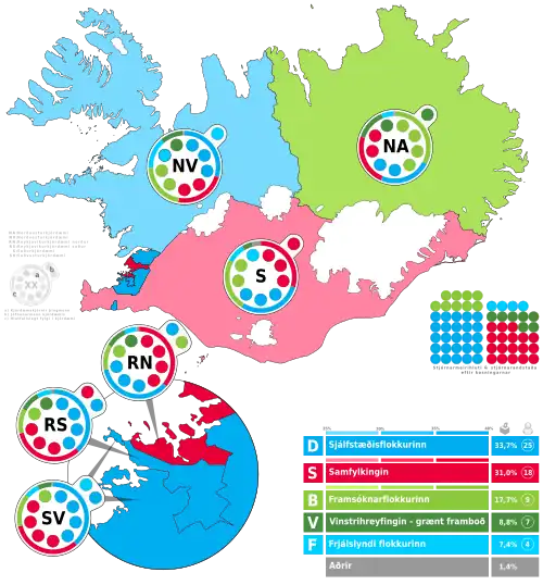 | Partei | Nordwest | Nordost | Süd | Südwest | Reykjavík Süd | Reykjavík Nord | |||||||