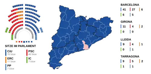 Das Parlament von Katalonien ist die einkammrige Legislative der Autonomen Gemeinschaft Kataloniens, die über eine legislative Befugnis in regionalen Angelegenheiten verfügt.[1] Die Wahl des Parlaments erfolgte auf der Grundlage des allgemeinen Wahlrechts. Alle in Katalonien gemeldeten über achtzehnjährigen spanischen Staatsangehörigen waren wahlberechtigt. Die 135 Mitglieder des Parlaments von Katalonien wurden nach dem D’Hondt-Verfahren und nach einem geschlossenen Verhältniswahlsystem gewählt, wobei in jedem Wahlkreis ein Schwellenwert von 3 Prozent der gültigen Stimmen – einschließlich leerer Stimmzettel – galt. Parteien, die die Schwelle nicht erreichten, wurden bei der Sitzverteilung nicht berücksichtigt. Die Sitze wurden den Wahlkreisen zugewiesen, was den Provinzen Barcelona, Girona, Lleida und Tarragona entspricht. Jedem Wahlkreis wurde eine feste Anzahl von Sitzen zugewiesen: 85 für Barcelona, 17 für Girona, 15 für Lleida und 18 für Tarragona. Das Wahlgesetz sah vor, dass Parteien, Verbände, Koalitionen und Wählergruppen Kandidatenlisten vorlegen durften. Die Zusammenschlüsse von Wählern waren jedoch verpflichtet, die Unterschriften von mindestens einem Prozent der in dem Wahlkreis, für den sie sich zur Wahl gestellt hatten, eingetragenen Wähler vorzulegen. Die Wählern durften nur auf einer Liste von Kandidaten zu unterschreiben. Gleichzeitig waren Parteien und Verbände, die beabsichtigen, eine Koalition einzugehen, um gemeinsam an der Wahl teilzunehmen, verpflichtet, die zuständige Wahlkommission innerhalb von zehn Tagen nach der Einberufung der Wahl zu informieren.