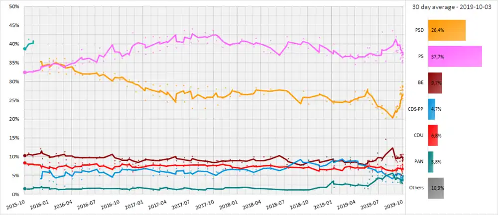 - ↑ Tilo Wagner: Vor den Parlamentswahlen - Portugals konservatives Lager zersplittert. In: Europa Heute. Deutschlandfunk, 2. Oktober 2019, abgerufen am 5. Oktober 2019.