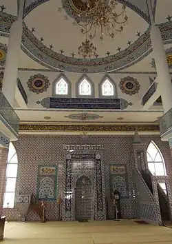 Der Innenraum ist mit hellen Farbmalereien ausgeschmückt. Um die Moschee liegen Rasenflächen, die bis zu den Gehsteigen der umliegenden Straßen reichen.