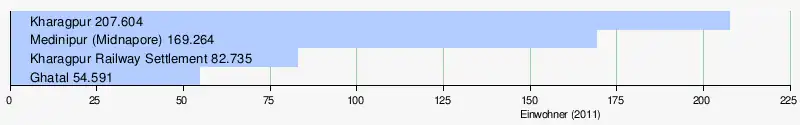 Weitere Städte mit einer Einwohnerschaft von mehr als 10.000 Personen sind (Einwohnerzahl in Klammern): Chandrakona (23.629), Ramjibanpur (19.611), Kshirpai (Khirpai) (16.384), Balichak (13.784) und Kharar (12.118).