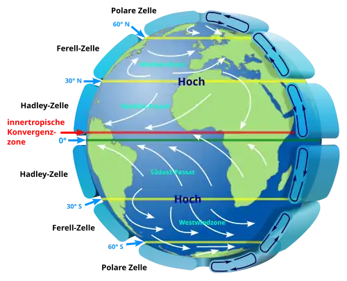 Planetarische Zirkulation. Die Innertropische Konvergenzzone (ITC) liegt im Jahresmittel etwa fünf Breitengrade oberhalb des Äquators, da sich auf der Nordhalbkugel größere Landmassen befinden, die sich stärker erwärmen als die Ozeane der Südhalbkugel.