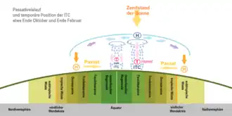 Aufgrund der Schiefe der Ekliptik verschiebt sich der Zenitstand der Sonne im Jahreslauf: Am Tag der Sommersonnenwende (Sommeranfang) steht die Sonne über dem nördlichen Wendekreis, am Tag der Wintersonnenwende (Winteranfang) über dem südlichen. Durch die jahreszeitliche Veränderung der Sonneneinstrahlung verlagert sich die Innertropische Konvergenzzone und mit ihr verschiebt sich auch das Windsystem der Passatzirkulationen zwischen den beiden Wendekreisen. Dadurch geraten viele tropische Regionen im Jahresverlauf regelmäßig abwechselnd unter den Einfluss des Nordost- und des Südostpassatwindes. Der Verlauf der Innertropischen Konvergenzzone kann zusätzlich aufgrund der Verteilung von Land- und Wassermassen bzw. deren unterschiedliches Erwärmungsverhalten sowie durch die Höhenzüge großer Gebirgsketten beeinflusst werden. So verlagert sich die Innertropische Konvergenzzone insbesondere über Nordpakistan und Indien durch den Himalaya im Sommer ungewöhnlich weit bis über den 35° Breitengrad hinaus.