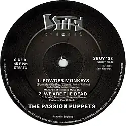 - 1983: Voices/Powder Monkeys (Stiff BUY 188, 12" + We Are the Dead)