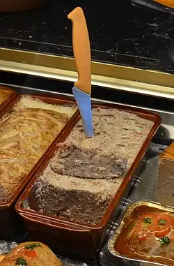 - Terrinen (von französisch terrine, das auf terre ‚Erde‘, zurückgeht) oder Schüsselpasteten werden ohne Teig in feuerfesten Gefäßen aus Steinzeug gebacken. Zur klassischen Zubereitung wird die Form mit dünnen Scheiben von fettem Speck ausgekleidet, mit der Farce und Einlagen fest gefüllt, mit weiteren Speckscheiben die Füllung bedeckt, die Terrine im Wasserbad im Backofen gegart, überschüssiges Fett abgegossen und alles mit einem schweren Deckel gepresst und kalt gestellt. Durch das sanfte Pressen (Beschweren) werden Hohlräume beim Abkühlen vermieden und die Masse zu einer Einheit verbunden. Dabei ist darauf zu achten, dass nicht zu stark beschwert wird, weil sonst das flüssige Fett herausgepresst und die Terrine trocken wird.