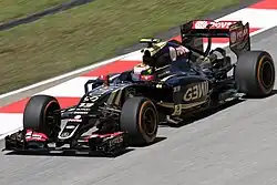 2014 wechselte Maldonado zu Lotus, wo er Teamkollege von Romain Grosjean wurde.[19] Bei der Einführung der permanenten Formel-1-Startnummern wählte er die 13 und wurde somit der zweite Fahrer der Formel-1-Geschichte, der mit dieser Startnummer ein Rennen bestritt. Zuvor startete lediglich der Mexikaner Moisés Solana beim Großen Preis von Mexiko 1963 mit dieser Nummer. Die Nummer 13 wurde nach mehreren tödlichen Motorsportunfällen in der Vorkriegszeit als unglücksbringend angesehen und in der Regel nicht mehr vergeben.[20] Ein neunter Platz beim Großen Preis der USA war Maldonados einzige Punkteplatzierung der Saison, die er auf dem 16. Gesamtrang beendete. 2015 bildeten Maldonado und Grosjean erneut das Lotus-Fahrerduo. Maldonado unterlag seinem Teamkollegen mit 27 zu 51 Punkten und erreichte den 14. Platz in der Fahrerweltmeisterschaft. Es war seine bis dahin beste Gesamtplatzierung in der Formel 1.