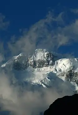 | Der Passugletscher mit dem Ostgipfel Pasu Diar (rechts, der Hauptgipfel ist dahinter verdeckt), links die Ghulkin Pyramide (5120 m) | ||
