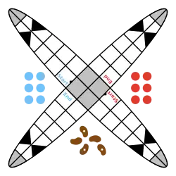 Was ebenfalls nicht vollständig geklärt werden konnte, sind die Funktionen der Felder, die hinter den dreieckigen Markierungen liegen. Ob sie ebenso als Zugfelder dienten, oder ob sie eine andere Bedeutung hatten, weiß man nicht mehr. Wenn es der Fall wäre, dass diese nicht als Zugfelder dienten, hat das Spiel somit insgesamt nur 44 Zugfelder.[2]