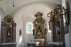 Der Hochaltar stammt aus der Zeit um 1690. Das Altarbild über dem Tabernakel zeigt eine Mondsichelmadonna. Es wird von zwei Säulenpaaren gerahmt und von Figuren der Apostel Petrus und Paulus flankiert. Im Auszug zeigt ein Gemälde vom Beginn des 20. Jahrhunderts Jesus als Knaben.