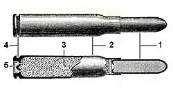 - Die Patronenkappe (metallisch) mit dem Anzündhütchen, zur Zündung des Treibmittels.