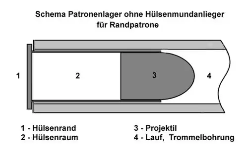 Eine andere Art der Hülsenabstützung ist die des Hülsenmundanliegers. In diesem Fall ist das Patronenlager geringfügig übermaßig zylindrisch gegenüber dem Lauf gebohrt. Der so entstehende Absatz (vergl. Bild 2.2) bildet für den Rand der eingelegten Patrone das abstützende Widerlager. Auch hier bläht sich im Schuss das Hülsenmetall leicht auf und dichtet den Lauf zum Verschluss hin ab, auch wenn der Verschluss mitsamt Hülse bei unverriegelten Waffen schon etwas zurückläuft. Diese Bauform des Patronenlagers wird in der Regel bei Patronen mit zylindrischen Hülsen ohne Rand eingesetzt.