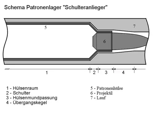 Beim Patronenlager für Flaschenhalspatronen muss auf die korrekte Länge geachtet werden. Ist der Abstand des Verjüngungskonus zu kurz, so lässt sich der Verschluss nicht schließen, ist er zu lang, so kann die Hülse aufblähen oder reißen.