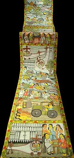 Seit den 1970er Jahren haben die Patua ihre Beschäftigung mit Bildrollen von der Vorführung schwerpunktmäßig auf die Herstellung derselben und von Einzelbildern verlagert. Eine Schätzung gibt für Anfang der 1970er Jahre in Westbengalen 5000 Personen an, die zur Berufskaste der Patua gehörten; Beatrix Hauser (2008) vermutet, dass Anfang der 1990er Jahre höchstens 100 Personen einen Teil des Jahres als Bildrollenerzähler unterwegs waren.[56] Ein Patua, der auf Wanderschaft geht, besucht die Dörfer nach einem Zeitplan, der sich an den hinduistischen Feiertagen und an den Erntezeiten orientiert. Dann sind ein größeres Publikum und eine üppigere Versorgung mit Naturalien zu erwarten. Die Monate von November bis Mai und das mehrtägige Jahresfest Durga Puja Ende September / Anfang Oktober sind allgemein günstige Zeiten für Auftritte. Manche Bilderzähler unternehmen Tagesausflüge, andere ziehen bis zu drei Wochen umher. Einen Übernachtungsplatz findet der Patua unter der Veranda eines Gehöfts oder eines öffentlichen Gebäudes.