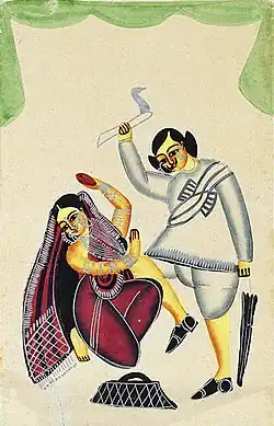 Die Schlacht bei Plassey 1757 leitete das Ende der Herrschaft der muslimischen Nawabs und die Machtübernahme durch die Britische Ostindien-Kompanie ein. Damit verfiel das Macht- und Kulturzentrum Murshidabad und die an den dortigen Palästen beschäftigten Künstler, Töpfer und sonstigen Kunsthandwerker zogen in die neue britische Hauptstadt Kalkutta. Dasselbe taten die in den Dörfern lebenden Bildrollenmaler. Die einen gründeten im Norden der Stadt das Kunsthandwerkerviertel Kumartoli (namentlich abgeleitet von kumar, „Töpfer“), in dem bereits eine alteingesessene brahmanische Oberschicht lebte. Zu dieser gehörte eine Musikerszene, in der Nidhu Babu (1741–1839) eine einflussreiche Persönlichkeit war. Einen kulturellen Gegenpol schufen die ländlichen Bildrollenmaler, die sich im Süden im später nach ihnen benannten Stadtviertel Patuapara in der Nähe des 1809 erbauten Kalitempels niederließen. Dort entwickelte sich bis zur Mitte des 19. Jahrhunderts die Kalighat-Malerei (kalighat pat), deren Stil der volkstümlichen Götterdarstellung für den religiösen Alltagsgebrauch und den Verkauf an Europäer bestimmt war. Die mythologischen Motive stammten aus den großen Epen Ramayana und Mahabharata. Ebenso fertigten die Patua ihre Bildrollen (patachitra) an. Die Missionare eines puritanischen Christentums hielten die Bilder für grob, unzüchtig und somit den zivilisatorischen Errungenschaften des christlichen Glaubens entgegenstehend. Die Kalighat-Malerei erlebte ihren künstlerischen Höhepunkt zwischen 1850 und 1890.[29] In dieser Zeit begann sich die bengalische Oberschicht in der Bengalische Renaissance genannten Reformbewegung unter der britischen Herrschaft ihrer eigenen kulturellen Werte rückzuversichern, was mit dem Bemühen verbunden war, an die ländliche Volkskultur anzuknüpfen. Damit ging auch der Versuch einher, die bengalischen Volksgruppen unter nationalistischen Vorzeichen zu vereinen. Dennoch war Anfang des 20. Jahrhunderts die bisherige Tradition der Bildrollenvorführungen im Niedergang begriffen und die handgemalten Aquarelle vom Kalighat wurden bis um 1930 durch billige Lithografien ersetzt.[30]