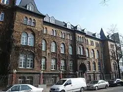 Durch spätere Anbauten zeigen drei Flügel unterschiedlicher Länge in den Hofbereich. Bis zu den Zerstörungen im Zweiten Weltkrieg befand sich über der südöstlichen spitzbogigen Toreinfahrt ein Spitztürmchen. Ein Staffelgiebel, gruppierte Rundbogenfenster und ein zweistöckiger Standerker gliedern das viergeschossige Bauwerk entlang der Straße.
