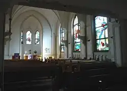 Auf dem Hof ergänzt eine kleine Kapelle ebenfalls im neogotischen Baustil das Bauensemble. Im Jahr 1991, nach fast 100 Jahren ihres Bestehens erhielt die Kapelle neue farbige Bleiglasfenster an den Seitenwänden und in der Altarapsis. Gestaltet wurden die insgesamt sechs Fenster nach Liedmotiven von Paul Gerhardt (Befiehl du deine Wege, Geh aus, mein Herz, und suche Freud, Ich singe Dir mit Herz und Mund, Wie soll ich dich empfangen, Sollt ich meinem Gott nicht singen?, Ich steh an deiner Krippen hier)[10] und von Erica Feist ausgeführt. Die schlichte Kapelle wird von einer Kreuzkuppel überwölbt; ihr hölzerner Altar steht auf der Estrade der weiß getünchten Altarapsis. Auf der Empore befindet sich eine kleine Orgel.