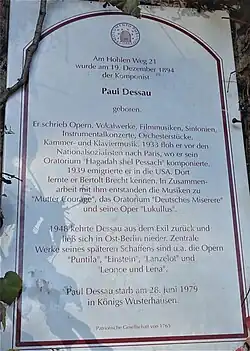 1954 zog Paul Dessau mit seiner Familie nach Zeuthen bei Berlin, wo er ein Haus in der Karl-Marx-Straße 20 erwarb (heute Niederlausitzstraße).[13]