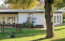 - 1962: Spiel mit Bausteinen. Mosaik 310 × 300 cm, Bildwerk aus Glasmosaiksteinen (farbiges Antikglas), Wandbehang / Farbgestaltung, Kindergarten Bergruthe 1, Hagen-Emst