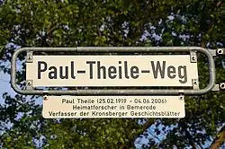 Mit seiner Darstellung Das Bemeroder Tagebuch des Jonas Lunde. Mittelpunkt der 500jährigen Geschichte eines Hofes am Rande des Kronsbergs begann Paul Theile von seinem Wohnsitz in der Anecampstrasse 12D aus seine im Selbstverlag herausgegebene Reihe Kronsberger Geschichtsblätter[3] mit Geschichten rund um die Halbmeier-Stelle der Patrizier-Familie von Lünde, die schon vor dem Dreißigjährigen Krieg mehrere Ratsherren in Hannover stellte.[4] Paul Theile zeichnete die Geschichten der Anderter Windmühle in der Kronsberger Mühlengeschichte nach, beschrieb die Landschaft und die Menschen und schrieb zum Jubiläum der Schule am Sandberge im Expo 2000-Jahr eine Kronsberger Heimatkunde.[3] Schon zuvor wurde Paul Theile, dessen Flurnamen-Forschungen schließlich zu zahlreichen Straßenbenennungen im Bereich des Kronsberges führten,[1] 1999 mit der Verleihung des Niedersächsischen Verdienstkreuzes am Bande geehrt, angesteckt durch Oberbürgermeister Herbert Schmalstieg im Neuen Rathaus von Hannover.[5]