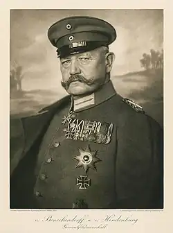 Bei Beginn des Ersten Weltkrieges hatte sich Hindenburg zunächst vergeblich um ein Kommando bemüht. Erst als die Lage an der Ostfront außer Kontrolle zu geraten drohte, wurde er zum Oberbefehlshaber der 8. Armee ernannt, mit Generalmajor Erich Ludendorff als Stabschef. Unter seinem Kommando wurde die nach Ostpreußen eingedrungene russische Narew-Armee in einer Umfassungs- und Vernichtungsschlacht (bei Tannenberg) geschlagen, die vom 26. bis zum 30. August 1914 andauerte. Dieser Sieg war für Hindenburg in zweierlei Hinsicht von entscheidender Bedeutung. Zum einen war er der Beginn der engen Zusammenarbeit mit Ludendorff, dessen strategischem Geschick der Sieg in erster Linie zu verdanken war – Hindenburg selbst traf kaum Entscheidungen und erwähnte wiederholt, dass er während der Schlacht sehr gut geschlafen habe. Zum anderen begründete er Hindenburgs ganz außerordentliches Prestige, das ihn im weiteren Verlauf des Krieges zum mächtigsten Mann in Deutschland machen sollte. An diesem politischen Mythos, der sich um seine Person und den Sieg ranken sollte, arbeitete er selbst aktiv mit. Unmittelbar nach der Schlacht setzte er durch, dass sie nach dem vom Kampfgeschehen am Rande betroffenen Ort Tannenberg genannt werden sollte. In der Schlacht bei Tannenberg (polnisch: Schlacht bei Grunwald) hatte 1410 ein polnisch-litauisches Heer den Deutschen Orden vernichtend geschlagen, eine „Scharte“, die der auf die Wirkung in der Öffentlichkeit bedachte Hindenburg durch die Namensgebung auszuwetzen versuchte.[4] Der triumphale Sieg wurde von der Öffentlichkeit in der Folge Hindenburg zugeschrieben und brachte ihm die Ernennung zum Generalfeldmarschall und die Verleihung des Sterns zum Großkreuz des Eisernen Kreuzes. Von großer Bedeutung und Nachwirkung war seine und Ludendorffs Rolle bei der ab 1915 erfolgenden Etablierung des Militärstaates „Land Ober Ost“.[5]