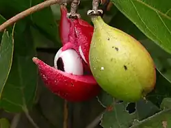 Die kahle, dreiteilige und septifrage Kapselfrucht, mit beständigem Kelch, ist zunächst grün, verfärbt sich später jedoch rot oder rosarot. Sie ist rundlich bis verkehrt-eiförmig. Sie wird 2,4 bis 3,6 cm lang und 1,1 bis 1,4 cm breit. Die Spitze ist abgerundet bis eingekerbt oder bespitzt mit Griffelresten, die Basis ist stark verjüngt, kragenartig. Die Frucht ist dreifurchig, zunächst fein behaart, aber später verkahlend und fein gekerbt und aufspringend. Die bis zu drei Samen sind schwarz, rundlich bis eiförmig oder ellipsoid, bis 1,5 cm lang und bis 8 mm breit, die Sarkotesta ist weiß.