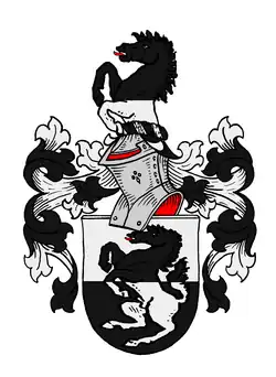 1753: Schild wie 1631. Zwei Helme, auf dem rechten mit schwarz-silbernen Decken ein wachsender schwarzer Adler, auf dem linken mit schwarz-goldenen Decken das wachsende Ross zwischen zwei Büffelhörnern, das rechte von Silber und Schwarz, das linke von Gold und Schwarz geteilt.