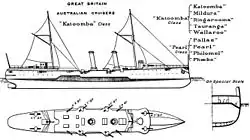 Die Katoomba war ein Geschützter Kreuzer 3. Klasse der Royal Navy. 1888 wurde sie bei Armstrong in Elswick, heute Ortsteil von Newcastle upon Tyne, als Kreuzer der Pearl-Klasse in Auftrag gegeben und lief am 27. August 1889 als HMS Pandora vom Stapel.[1] Am 2. April 1890 wurde sie in Katoomba umbenannt.