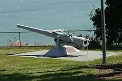 Die Waffe weist auf das in der Bucht liegende Wrack, das dort in 27 m Tiefe auf 12° 29′ S, 130° 50′ O liegt.