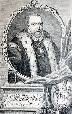 - ↑ Peder Oxe (1520–1575). In: kongegrave.dk. Abgerufen am 15. Februar 2025 (dänisch).