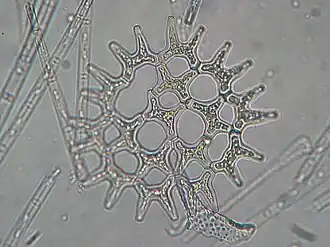 Ihre aus 8 bis 32 Zellen bestehenden Kolonien haben die Form eines durchbrochenen Zackenrädchens. Die Größe ist sehr variabel; die der Zellen reicht von 4 bis 80 Mikrometer, die der Kolonien von 30 bis 300 Mikrometer. Zwischen den Mittelzellen befinden sich große Zwischenräume. Die Randzellen sind nur an der Basis verwachsen und tief ausgeschnitten. Ihre beiden Lappen verlängern sich in sehr vielgestaltige Fortsätze. Die Zellmembran ist entweder glatt, punktiert oder weist netzförmige Leisten auf.