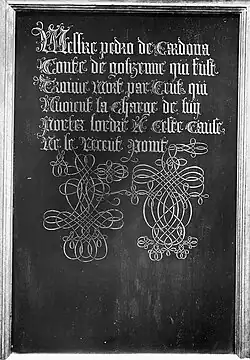 - ↑ Marjolijn Kruip in der Zusammenfassung der kunsthistorischen Untersuchung zum Wappenbord in der Grote Kerk in Den Haag (Nord 11); die Inschrift lautet: „Messire pedro de Cardona / Conte de golizenne qŭi fŭst / Troŭŭé mort par Ceŭt qŭi / Aŭoient la Charge de lŭij / Porter lordre A Ceste Caŭse / Ne le receŭt point“ (siehe Abbildung).