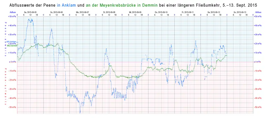 | Abfluss am Pegel Anklam Straßenbrücke[2] negative Werte bei Strömungsumkehr AEo: 5012 km² |
