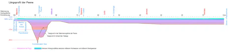 Der Wasserspiegel des Kummerower Sees liegt durchschnittlich nur 0,15 m über dem der Ostsee (Mittelwasser am Ausfluss des Kummerower Sees in Aalbude 0,16 m ü. HN, im Peenestrom −0,02 m ü. HN).[8] Die Wassertiefe beträgt am Abfluss des Kummerower Sees 2 m (Fahrwasser),[9] in Demmin 4 m und in Anklam 5 m. Damit liegt die Gewässersohle von der Mündung bis in den Kummerower See durchgängig unter dem Meeresspiegel.