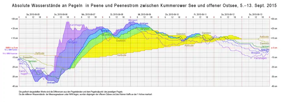 Außer vom Wasserstand in der offenen Ostsee und im Stettiner Haff ist das Gefälle des Wasserspiegels der Peene von der abzuführenden Wassermenge abhängig, ein allgemeines Phänomen bei Flüssen mit sehr geringem Gefälle. Nach langer Trockenheit kann der Höhenunterschied zwischen Malchiner See und Peenestrom weniger als einen Dezimeter betragen.[13] Der bisher (1961 bis heute) niedrigste gemessene Wasserstand am Pegel Dahmen lag mit –1 cm unter NHN.[14] Wegen der Windkesselfunktion des Kummerower Sees verhindert niederschlagsbedingtes Hochwasser der Zuflüsse aus dem Binnenland Strömungsumkehrungen der unteren und mittleren Peene aber nicht.