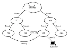 Es ist allerdings durchaus möglich, dass ein größerer Anbieter (Tier-1) mit einem kleineren (Tier-2) Daten austauscht, weil er entweder daraus selber einen Nutzen ziehen kann oder von dem kleineren Partner für seine Dienste Geld verlangen kann (Paid Peering).[3] Dieser Bereich steht in den letzten Jahren im Fokus, da großen Dienstanbietern wie Verizon und der Deutschen Telekom vorgeworfen wird, den Austausch künstlich zu bremsen.[4][5] Ein regelmäßiger indirekter Datentransfer zwischen unterschiedlich großen Anbietern wird dagegen oft nach Datenmenge abgerechnet und Transit genannt.[6]