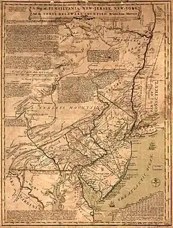 Am 31. Mai 1749 brach Kalm mit einer kleinen Yacht, die auf dem Delaware River pendelte, auf. Sie passierten Burlington und erreichten Trenton am nächsten Tag.[R 41] Dort reisten sie mit einem gemieteten Fuhrwerk weiter. Am Abend des 2. Juni erreichten sie Neu-Braunschweig. Am nächsten Tag begaben sie sich auf eine Yacht, die sie nach New York brachte.[R 42] Am 10. Juni segelten sie auf dem Hudson River in Richtung Albany weiter.[R 43] Drei Tage später erreichten sie ihr Ziel.[R 44]