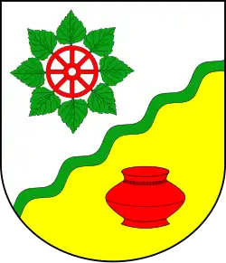 Blasonierung: „Von Silber und Gold durch einen schräglinken grünen Wellenbalken gesenkt geteilt. Oben ein rotes achtspeichiges Rad in einem Kranz von acht grünen Birkenblätter, unten eine rote Urne.“[7]
