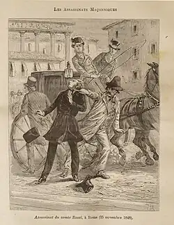 Zwei Monate später, am 15. November 1848, wurde Rossi bei der Eröffnung der Deputiertenkammer auf der Freitreppe des Palastes der Cancellaria ermordet. Ein Dolch traf ihn an der Kehle und trennte seine Halsschlagader durch, so dass er verblutete. Das Attentat war das Signal zum Ausbruch der Revolution im Kirchenstaat, worauf am 23. November die Flucht des Papstes folgte. Der politische Mord löste einen Sturm der Empörung aus, insbesondere unter den Konservativen ganz Europas.