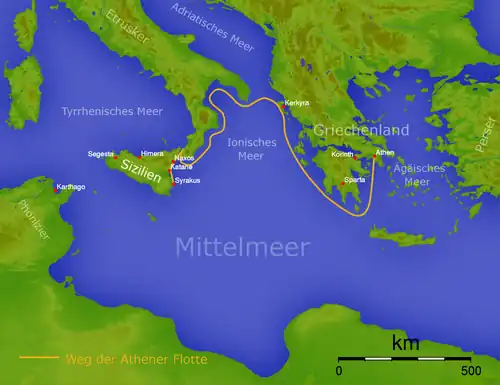 Schließlich zog unter dem Kommando des Alkibiades, des Nikias und des Lamachos eine gewaltige Flotte von 134 Trieren und etwa 5000 Hopliten (die Streitmacht wurde später noch verstärkt) im Jahre 415 v. Chr. nach Sizilien. Die Gesamtstärke der Expedition betrug insgesamt rund 32.000 Mann (6.400 Mann Landungstruppen und über 25.000 Ruderer). Allein das Athener Kontingent (100 Trieren, 1500 Hopliten) war die bei weitem größte Expeditionsflotte, die je eine einzelne Polis ausgerüstet hatte – noch dazu operierte sie fern der Heimat. Alkibiades jedoch wurde noch vor Ankunft des Heeres in Sizilien nach Athen zurückberufen, wo er sich einem Prozess stellen sollte: Angeklagt wurde er wegen des Hermenfrevels und aufgrund der Anschuldigung, einen Religionsfrevel verübt zu haben (er soll die Mysterien von Eleusis verspottet haben). Er lief daraufhin zum Gegner Sparta über.