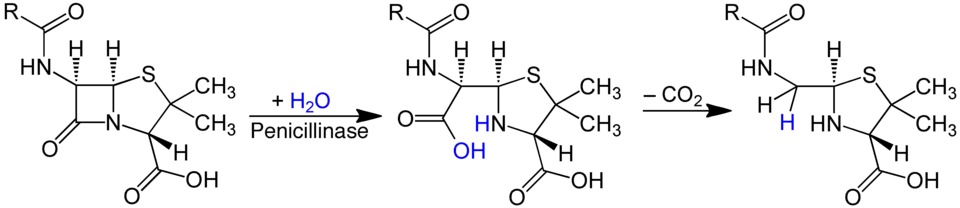 Penicillinase ist ein von verschiedenen Bakterien produziertes Enzym, welches in der Lage ist, eines oder mehrere Penicillin-Antibiotika „unschädlich“ zu machen. Die Penicillinase spaltet dabei den β-Lactam-Ring der Penicilline hydrolytisch, womit die antibiotische Wirksamkeit des Arzneistoffes verloren geht. Es gibt halbsynthetische Penicilline mit einer chemisch modifizierten Seitenkette (verschiedene Reste R, siehe Abbildung), die gegen manche Penicillinasen resistent sind.