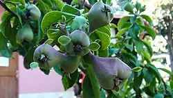 Die rosafarbenen, hellrosafarbenen oder mehr oder weniger purpurroten Blüten stehen in endständigen oder seitlichen Blütenständen aus 10 bis 15 (selten bis zu 30) Einzelblüten zusammen. Ihr Blütenstiel ist bis zu 3 Zentimeter lang. Sie erreichen Durchmesser von 3 bis 5 Zentimeter. Der Blütenboden ist kreiselförmig und weist Kanten oder Furchen und erhabene Höcker auf. Die birnen- bis kreiselförmigen Früchte stehen meist in Gruppen zusammen. Sie sind 5 bis 10 Zentimeter lang und weisen Durchmesser von 3 bis 7 Zentimeter auf. Bei Reife sind sie grün bis gelb.