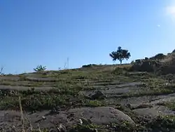 Die obere und mit 150 × 70 Metern zugleich größte Terrasse war ein von Säulenhallen und anderen Gebäuden umgebener Hof, der allein rund 36 Metern × 74 Metern maß. Dieser als Palästra anzusprechende Komplex besaß hinter seiner nördlichen Säulenhalle einen theaterförmigen Unterrichtsraum wohl römischer Zeit und mittig einen großen Festsaal. Weitere Räume unklarer Funktion waren von den Säulenhallen aus zugänglich. Im Westen stand ein nach Süden gerichteter ionischer Antentempel als zentrales Heiligtum des Gymnasions. Der Ostbereich wurde in römischer Zeit durch eine Thermenanlage überbaut. Weitere römische Bäder wurden westlich des ionischen Tempels errichtet.[70]