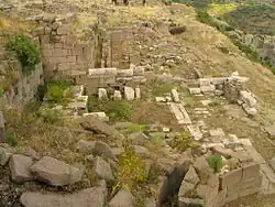 Das rund 50 × 110 Meter umfassende Demeterheiligtum lag auf dem mittleren Absatz im Süden des Burgbergs. Das Heiligtum selbst ist alt, seine Nutzung lässt sich bis ins 4. Jahrhundert v. Chr. zurückverfolgen.