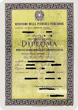 - ↑ Vgl. Das Berufsbildungssystem in Italien. Kurzbeschreibung. Amt für amtliche Veröffentlichungen der Europäischen Gemeinschaften: Luxemburg 2003. — Einordnung der Berufsqualifikation im Informationsportal für ausländische Berufsqualifikationen des deutschen Bundesministeriums für Wirtschaft und Energie (abgerufen am 22. September 2018)