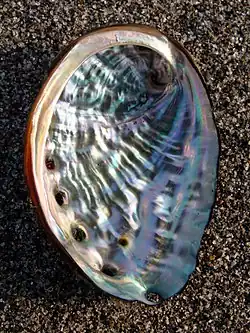 Perlmutt, auch Perlmutter (von mittelhochdeutsch berlīnmuoter, Lehnübersetzung von lateinisch mater perlarum „Muschel, die eine Perle enthält“ bzw. wörtlich „Mutter der Perlen“, also Muschel, die eine Perle „geboren“ hat;[1] vgl. englisch mother-of-pearl) ist die innere, perlenartige Schicht der Schale verschiedener Weichtiere, insbesondere der See- und Perlmuscheln.[2][3] Es ist ein natürliches Verbundmaterial aus Calciumcarbonat und organischen Substanzen, das die innerste Schicht („Hypostracum“) oder den gesamten, vorwiegend mineralischen Teil der Schale bestimmter Mollusken bildet. Aufgrund seiner speziellen Oberflächenstruktur, die bei Lichteinfall einen matten, irisierenden Glanz erzeugt, findet es Verwendung bei der Herstellung von Kunstgegenständen wie z. B. Schmuck und Zierknöpfen.