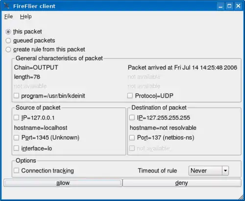 Fireflier ist ebenfalls eine Personal Firewall, die sowohl detailliert interaktiv konfiguriert werden kann als auch eine mit IP-Adressen und -Ports kombinierte Anwendungskontrolle erlaubt. Sie stellt sowohl für KDE wie GNOME ein Clientprogramm zur Verfügung. Mit der Oberfläche lassen sich individuelle iptables-Regeln festlegen, inklusive Stateful Inspection.